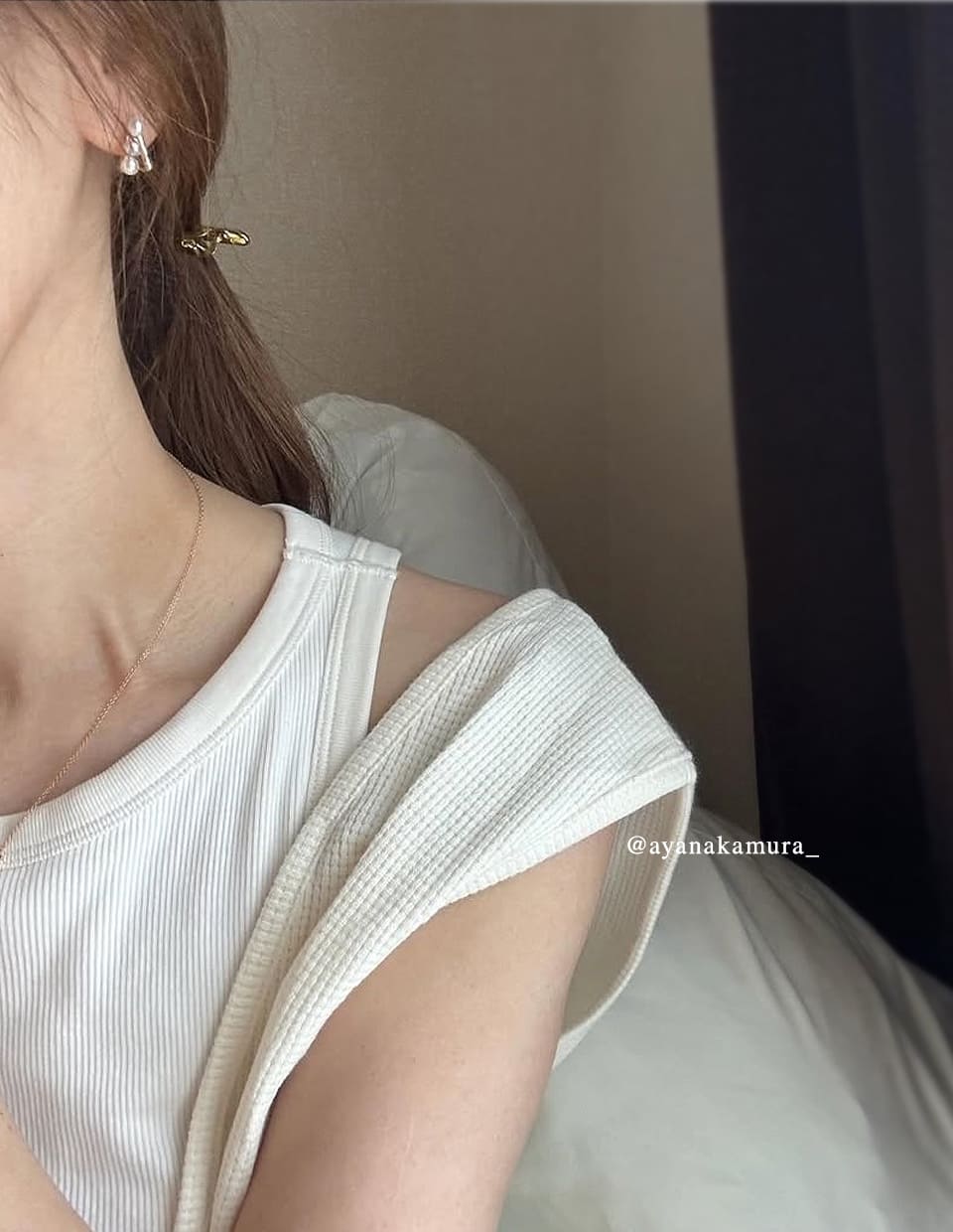 昔は「パールのピアスは可愛いらしすぎる」という抵抗感がありましたが、シルバーと横並びの縦ラインが自分の中のパールのハードルを下げてくれました。顔の印象も明るくなるから、人と会う時おすすめ◎