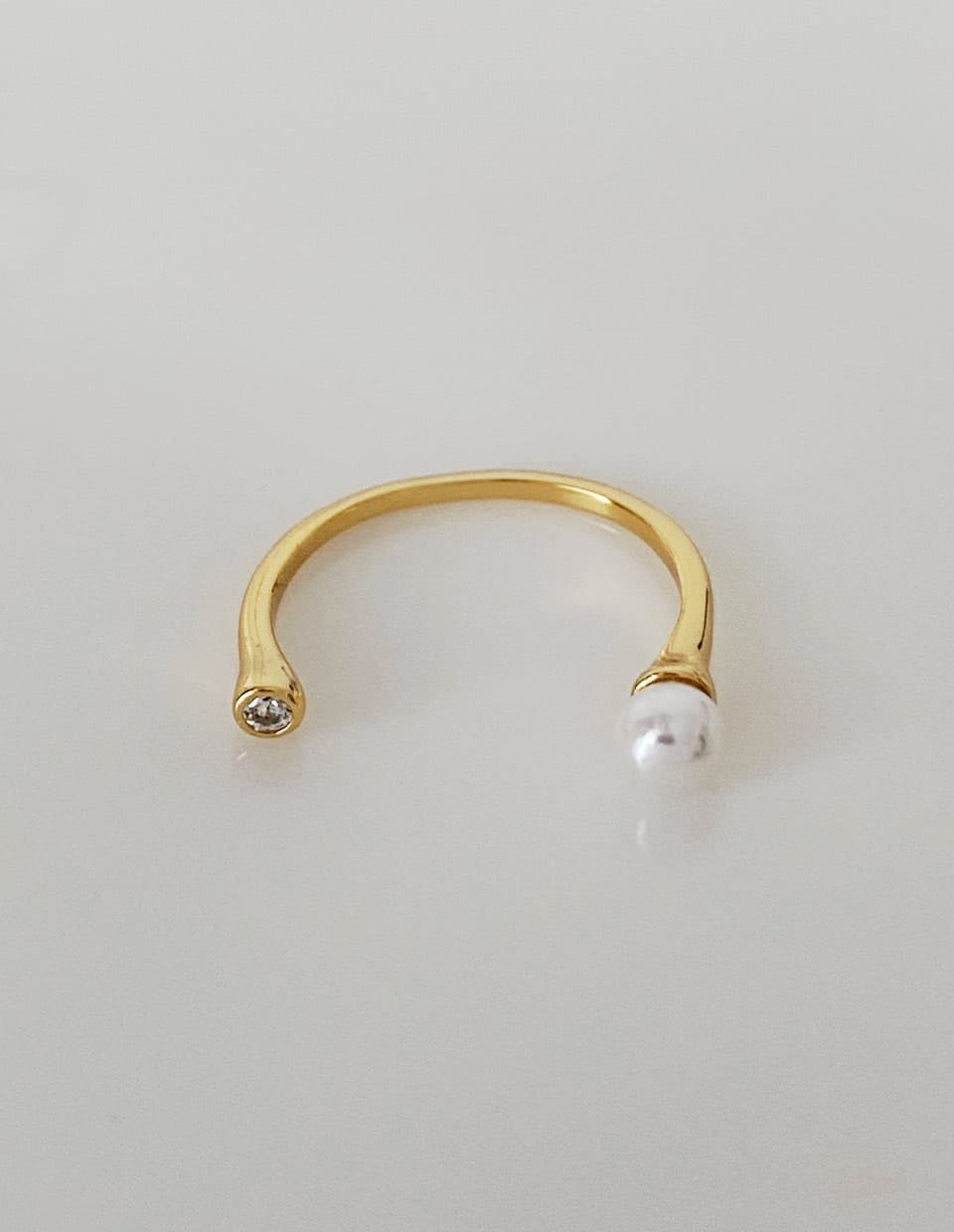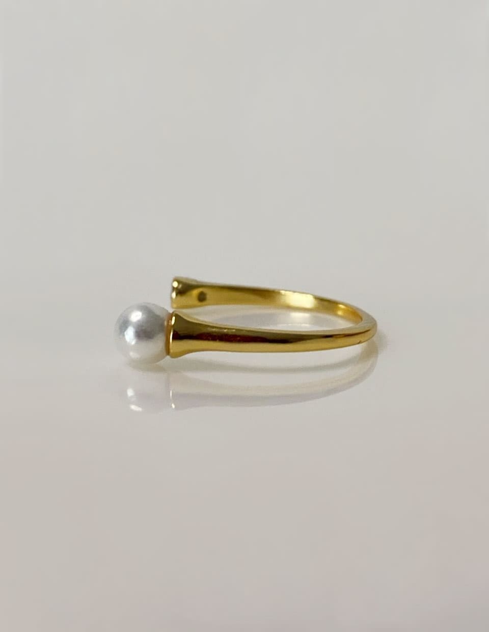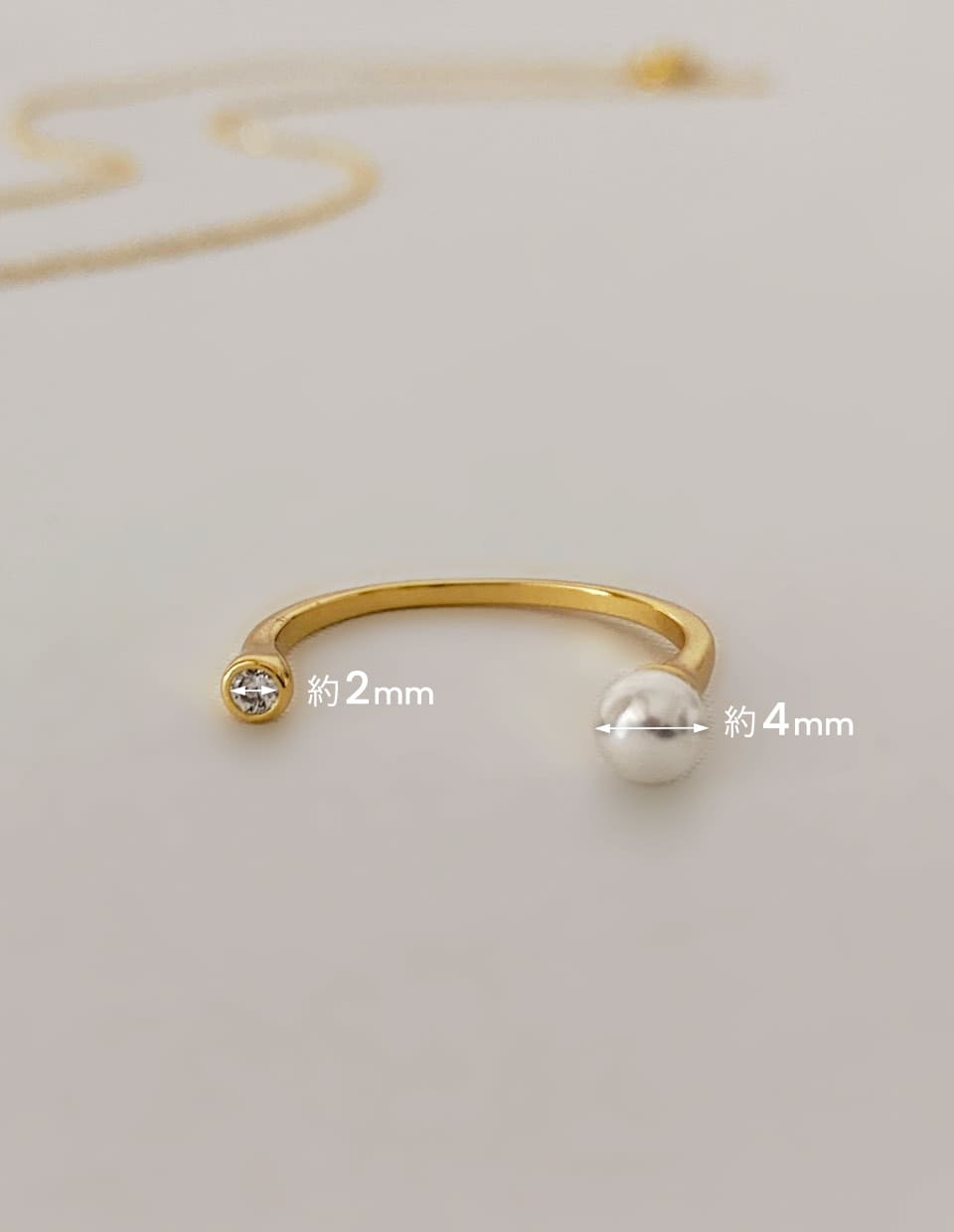 指をぐるりと囲わず、左右の“端”に小さな光を添えたオープンリングです。